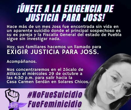 Atlixco. Convocan a marcha para exigir justicia y muerte de Joss Barojas en Atlixco, su familia no acepta que fue un suicidio y solicitan que la investigación por parte de la Fiscalía General del Estado (FGE) de Puebla esclarezca el caso debido a que ella era víctima de violencia intrafamiliar por parte de su pareja sentimental.