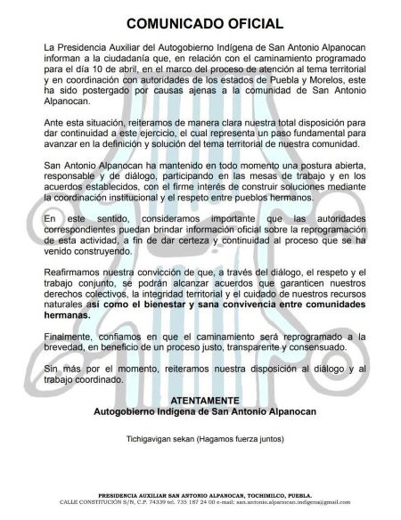 Por. Angelina B. Gradas 22:34:28 04/14/2026 Tochimilco. El protocolo de revisión de la zona en conflicto por límites territoriales entre las comunidades de San Antonio Alpanocan, Tochimilco, Puebla y Hueyapan, Tela del Volcán, Morelos; se pospone hasta nuevo aviso, así lo dio…