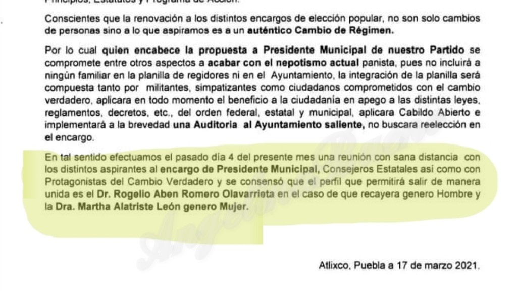 Y continua el texto: "verdaderos protagonistas del cambio en el municipio y en apego a nuestros estatutos, principios y programas de acción. Sobre todo porque estamos conscientes la renovación de los cargos de elección popular no sólo son cambios de personas, también es un auténtico cambio de régimen”.
