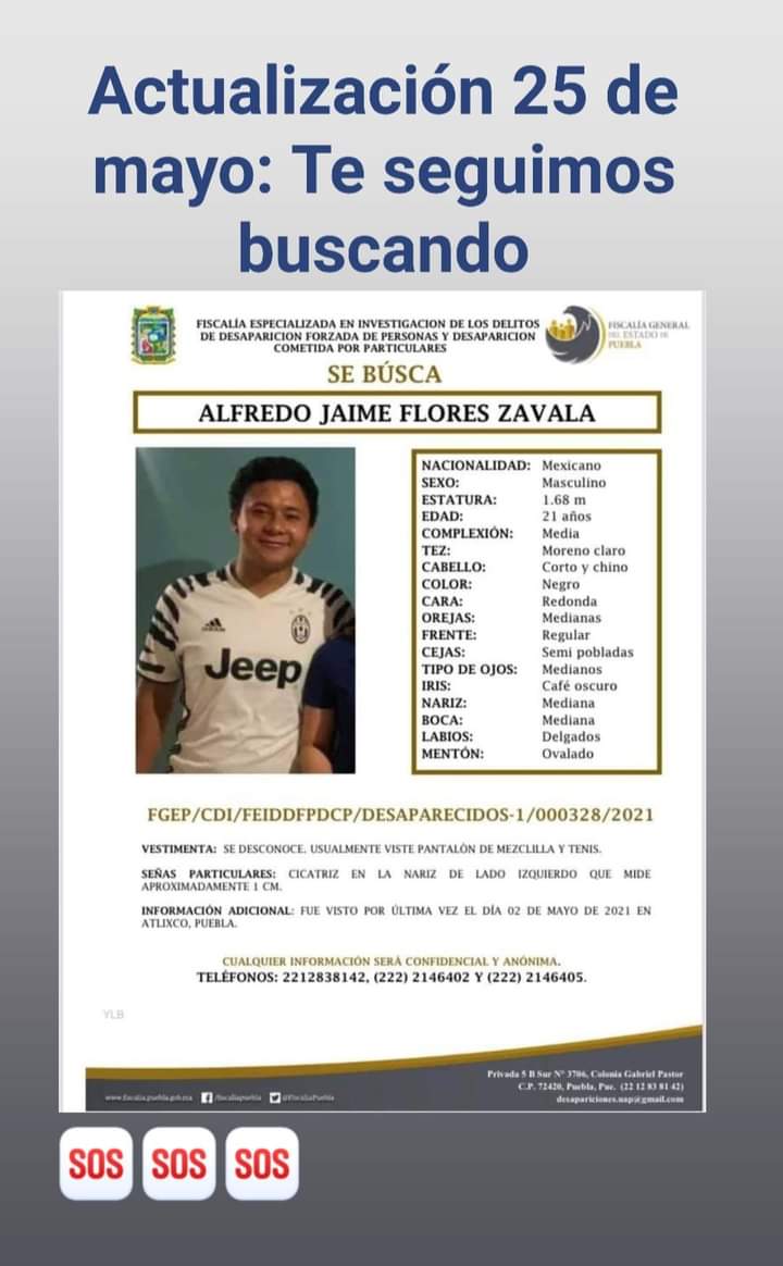 Fue este 25 de mayo cuando volvieron colgar en las redes sociales su ficha como desaparecido, con la leyenda “SOS” y la frase “Actualización, te seguimos buscando”. Cabe recordar que Alfredo es estudiante del Instituto Tecnológico Superior de Atlixco (ITSA) y habitante de este municipio.