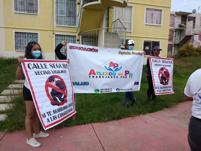Atlixco. Las asociaciones civiles están sacando la casta en este municipio para aportar su granito de arena en la solución de diversas problemáticas sociales, un ejemplo de ello es “Atlixco de Pie”, que actualmente prevención en materia de seguridad. A la fecha no solo se encarga de entregar silbatos de alerta si no también lonas para que a los delincuentes les quede claro que es una comunidad organizada.