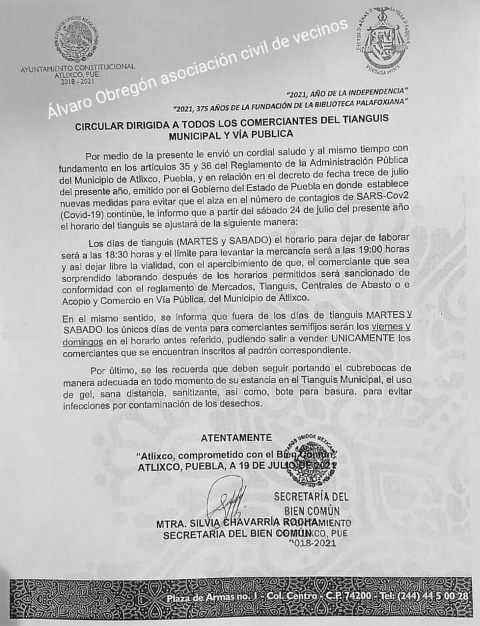 “Los días martes y sábados la zona deberá quedar libre a las 19 oras y media hora después la vía pública debe quedar libre. Y no a las 20 horas tal y como estaba marcado antes del decreto estatal emitido la semana pasada”, detalló Silvia Chavarría, secretaria del Bien Común en el Ayuntamiento.