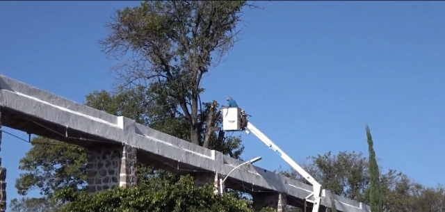 A las 9 de la mañana llegó una grúa del departamento de alumbrado de Atlixco para subir y acercar a un trabajador a la rama de más de 150 kilos que prácticamente estaba montada sobre el viejo e histórico acueducto.
