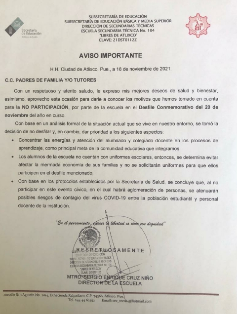 “Con base en los protocolos establecidos por la secretaría de Salud se concluye que al no participar en este evento cívico, en el cual habrá aglomeración de personas, se atenuarán posibles riesgos de contagios del virus Covid 19 entre la población estudiantes y el personal administrativo”, explicó el director de la institución, Sergio Enrique Cruz.