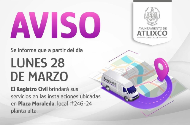 Las nuevas oficinas se ubicarán en los locales 246 y 247, planta alta de Plaza Moraleda, los servicios que podrán realizar los atlixquenses seguirán siendo: registro de nacimiento, registro de defunción, matrimonios, así como extractos y copias fieles de dichos documentos, en un horario de lunes a viernes de 8 de la mañana a 4 de la tarde. Los días sábados el personal solo operará de 9 a 12 horas para facilitar actas de defunción, para más información, los interesados pueden comunicarse al 244 443 8237 ext. 4002.