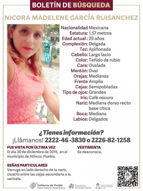 Atlixco. Buscan a Nicora Madelen García en una propiedad en los límites de las colonias Ricardo Flores Magón y Maximino Ávila Camacho. Ella desapareció el 30 de diciembre del 2019, han sido diversos los operativos que se han realizado en su búsqueda, pero hasta hoy se vio el uso de trascabos en un predio vecino al domicilio que habitaba en vida junto con su expareja.