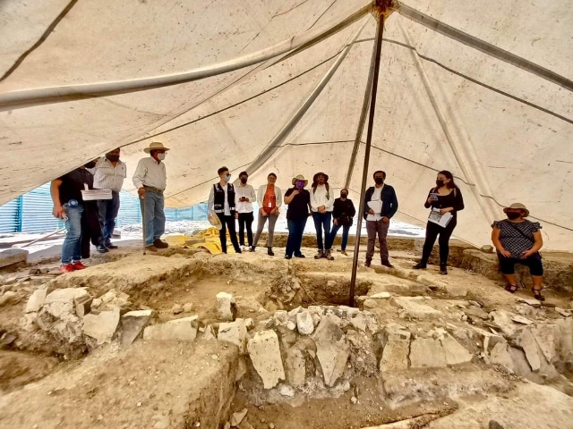 En una imagen colgada en las redes sociales del gobierno local se puede ver a la presidenta Ariadna Ayala Camarillo, junto gente de su gabinete y representantes del Instituto Nacional de Antropología e Historia (INAH) meterse bajo la lona con la que intentan cubrir los vestigios de las inclemencias del tiempo.