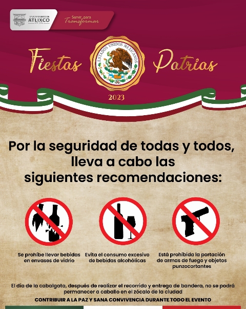Por su parte, la Secretaría de Seguridad Pública, desplegará a elementos para auxilio durante la Cabalgata, Grito de Independencia, eventos populares y Desfile del 16 de septiembre, en juntas auxiliares, así como en el Centro Histórico de la Ciudad, donde se vigilará activamente que no se presente el ingreso de armas de fuego, objetos punzocortantes, pirotecnia, cinturones con hebilla, bebidas embriagantes o de cualquier tipo en botellas de vidrio, sombrillas, bates, aerosoles, apuntadores láser, entre otro cualquier artículo que ponga en riesgo la integridad de los asistentes.