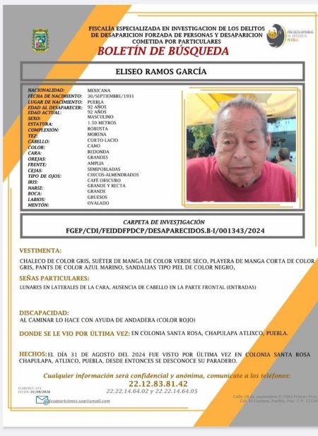 Atlixco. La familia de Eliseo Ramos solicita a la comunidad atlixquense que no se detenga la búsqueda de este adulto mayor quien lleva ya 27 días desaparecido. No pierden la esperanza de encontrarlo con vida.