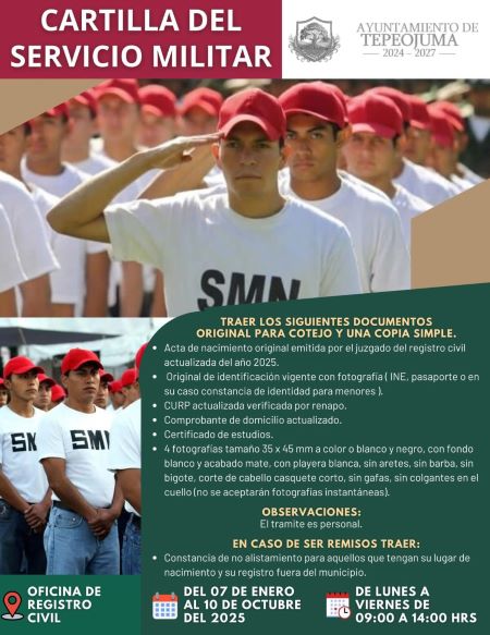 Tepeojuma. El trámite de la cartilla militar empezó en este municipio, la convocatoria para los jóvenes a que se acerquen a las instalaciones de la presidenta municipal para obtener información sobre el proceso.