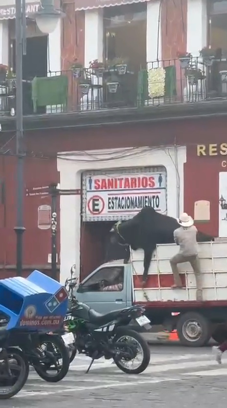 Atlixco, Puebla. Un toro intentó escapar de la camioneta que lo trasladaba en el centro de Atlixco, pero fue contenido a tiempo por uno de los hombres que viajaban en la unidad. El incidente fue captado en video por Rosita Tapia, una usuaria de redes sociales, mientras la camioneta circulaba sobre la calle 3 Sur.