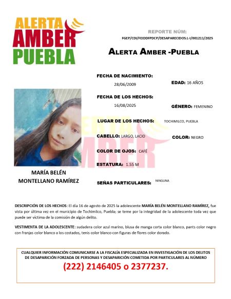 No obstante, el 16 de agosto de 2025, la familia volvió a reportar su desaparición y emitió una nueva solicitud de apoyo para encontrar a María Belén Montellano Ramírez. Según la ficha oficial, la adolescente fue vista por última vez en Tochimilco y existe preocupación sobre su seguridad e integridad física.