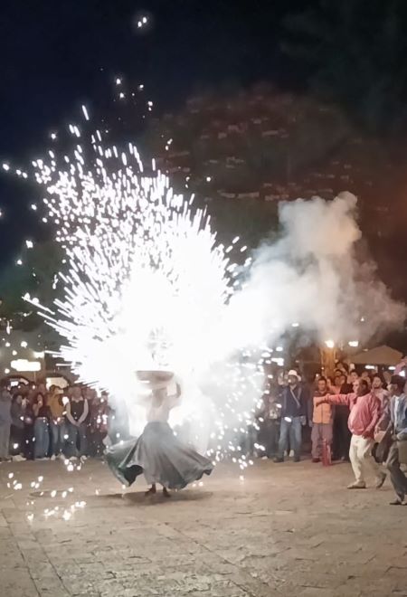 El lugar se llenó de humo, de música, de algarabía mientras Laura danzaba son los brazos cubiertos por un rebozo y los cuetes tronaban lanzando chispas al ritmo de las vueltas que daba la china atlixquense, todo ante los ojos asombrados de los espectadores. Salió disparada la corona de pirotecnia hacia el cielo oscuro, los pedazos de papel encendido cayeron de vuelta hacia la plaza, pero nadie se retiró, estaban envueltos en la magia de la danza.
