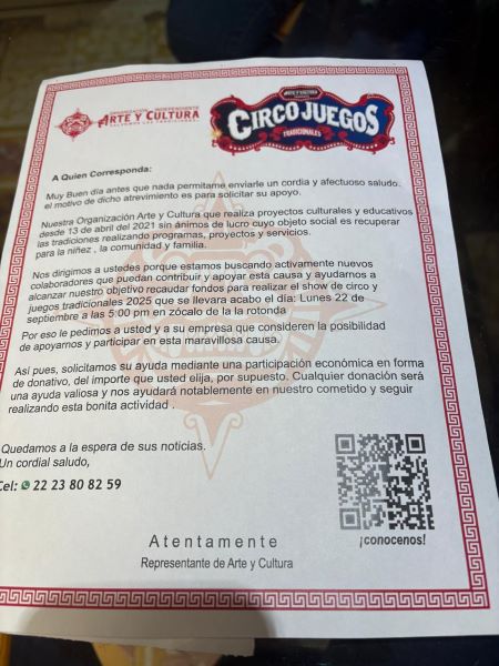 Además con este aviso buscan prevenir a otras colonias de la presunta existencia de este grupo artístico y cultural que en el volante pide apoyo económico y voluntarios para la realización de eventos en donde se rescaten las tradiciones mexicanas. Asegura el volante que el evento más próximo es referente a las fiestas patrias y se efectuará en el parque de la colonia.