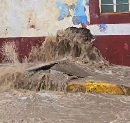 Atlixco. Tras la tormenta de esta tarde en Atlixco la fuerza del agua que baja por la calle tres poniente en el centro de la ciudad rompió la pared de una casa que se encuentra deshabitada desde hace años. Esto ocurrió en la esquina con nueve sur. El agua brotaba, no solo por la perforación, sino también por la puerta de metal que aún conserva la casa.