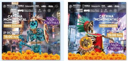 Atlixco. Este 27 de octubre Valle de Catrinas internacional será inaugurado en Times Square, para ello se instalaron en este punto de la gran manzana dos de la monumentales firutara se trata de El Guerrero Jaguar y Cuauhtémoc. El acto protocolario será a las 15 horas.