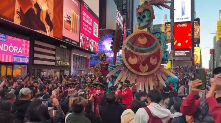 Times Square ya luce al Guerrero Jaguar y a Cuauhtémoc las dos monumentales figuras de Valle de Catrinas