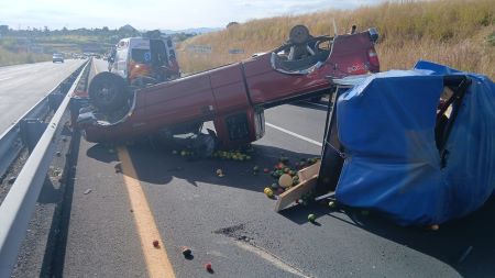 El siniestro se registró cerca del entronque con la federal a Izúcar de Matamoros con sentido a Atlixco. La fuerza del impacto separó la batea de la cabina y regó la mercancía que transportaba.