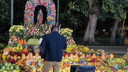 Desde entonces retomó el recorrido que hace cada noche-madrugada del 11 y 12 de diciembre, en este 2025 llegó al altar de frutas que colocan en la cara poniente del parque de la Rotonda en la colonia Álvaro Obregón, sacó su mesa, bocina, mezcladora, micrófonos y celular, conecto todo y empezó a cantar.
