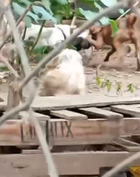 En el texto que acompaña las lamentables imágenes señala que lo grabaron personas que atravesaba por el lugar y señala que la dueña de la casa y los perros fue quien lanzó al gato para que lo acabarán.