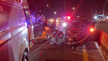 Eran las 11 de la noche cuando se solicitó una ambulancia debido a un fuerte choque, cuando los paramédicos llegaron encontraron a dos personas lesionadas que tripulantes un vehículo negro que había quedado destrozado tras chocar con el muro de contención.