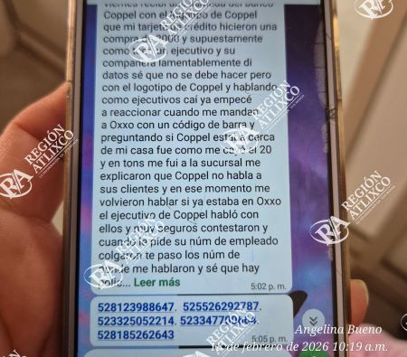 Coquis apuntó que compartió este intento de fraude, que por fortuna no se concretó, para alertar a los atlixquenses a no caer en el engaño, sobre todo a las personas de la tercera edad que, como ella, no desconfían si ven los logotipos de las grandes empresas en el perfil de la mensajería instantánea o en el de llamada telefónica.